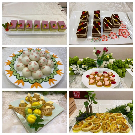 白案理论考试聚焦食堂配餐标准与食品安全法。实操项目中选手制作了香蕉煎饼、榴莲千层、慕斯蛋糕等多样面点,展现了选手的创意与技艺。作品经评委现场评分,并邀请顾客参与品尝。